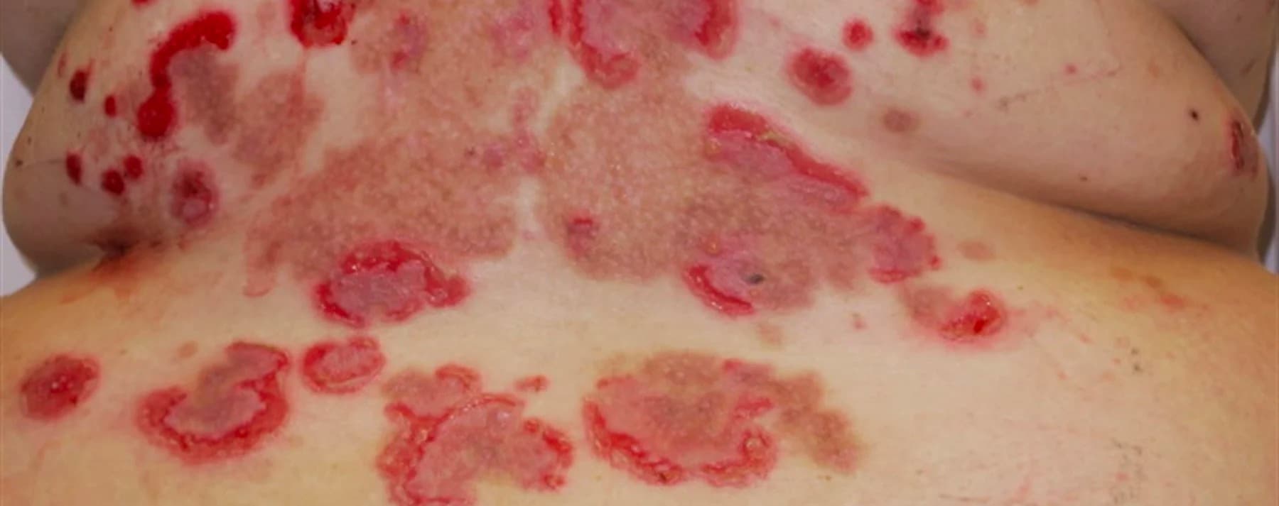 - The skin lesions start as thin-walled fragile blisters (collections of clear fluid within the skin) that burst easily, leaving raw areas known as erosions.