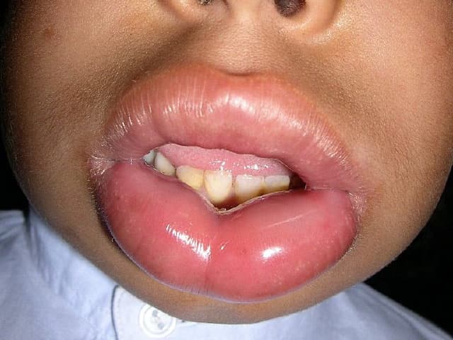 - Hereditary angio-oedema– this is a very rare form of angio-oedema, which usually runs in families because it is due to a genetic mutation. Patients have intermittent swelling of the face, mouth, throat, and sometimes of the gut, leading to colic. The condition is due to an inherited deficiency of a blood protein or a non-functional version of C1 inhibitor and can be identified by a blood test. It can be treated by medicines to prevent attacks and sometimes by replacing the deficient protein in the blood during an acute attack. A severe attack of hereditary angio-oedema affecting the throat can be life threatening if left untreated; therefore, patients may be advised to wear Medic Alert bracelet or an alert on their mobile phone for an emergency.