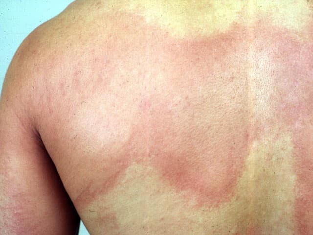 Itchy raised skin reactions, round or ring-shaped, and may join together