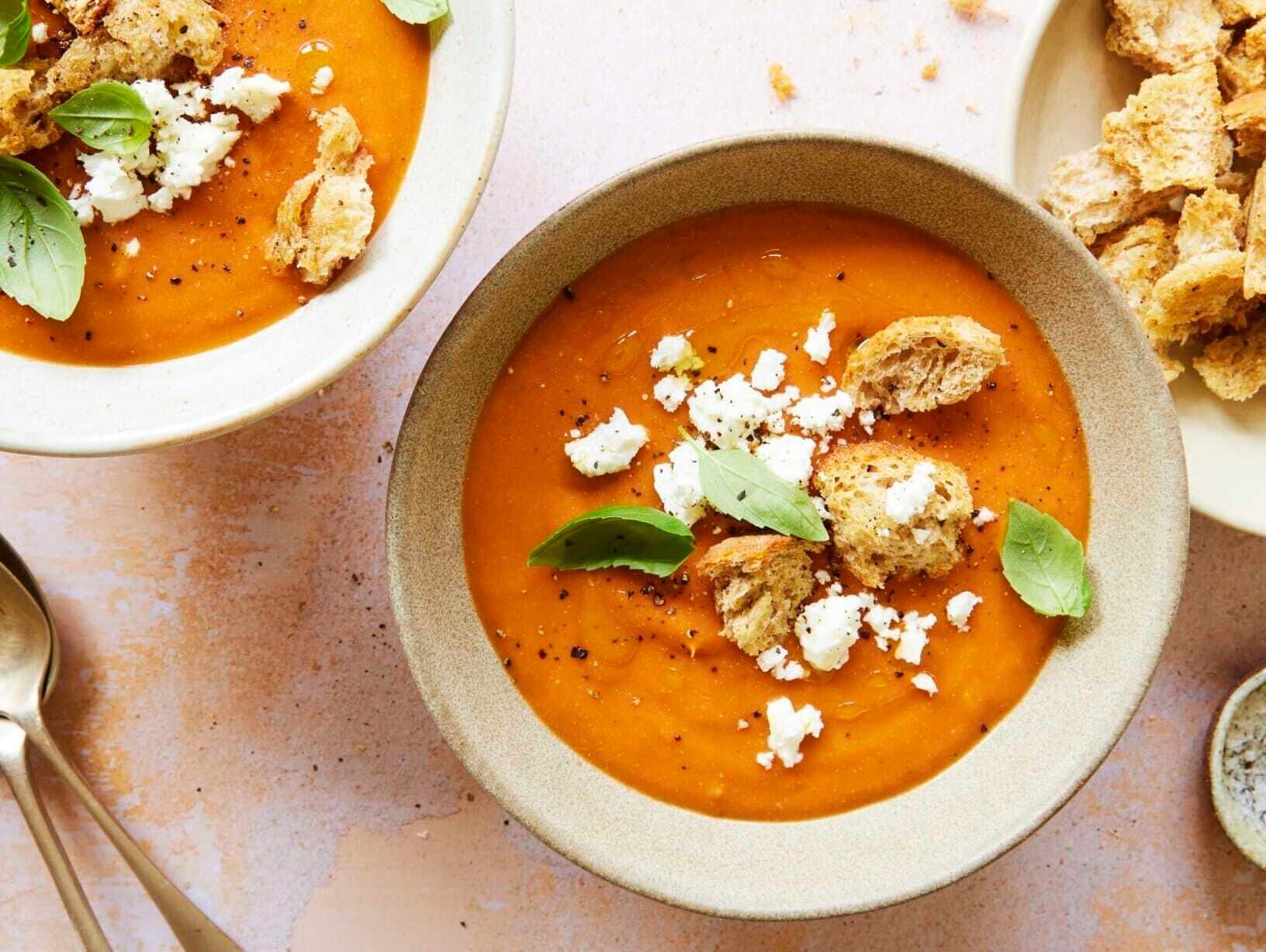 Ladle into bowls and garnish with torn basil leaves. Serve with the crunchy croutons.